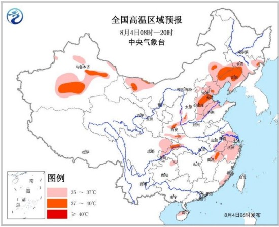 全国高温区域预报(8月4日08时-20时)