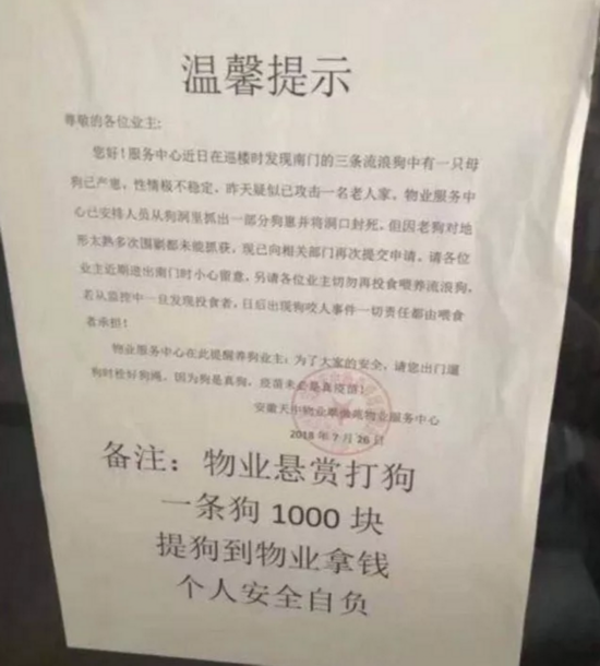 尤为引人注意的是,文中特别备注:物业悬赏打狗,一条狗1000块,提狗到物业拿钱,个人安全自负。
