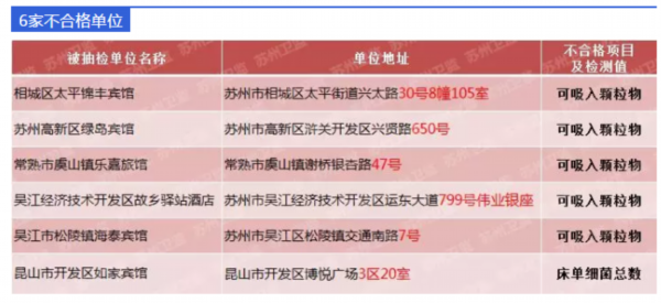 住宿场所此次随机抽取了19家单位进行检查,1家单位关闭,实际营业单位18家,其中合格单位12家,不合格单位6家。执法人员对上述单位的卫生许可证、员工健康证及相关制度落实情况进行了检查,并对床单卧具、茶杯的卫生指标,室内空气质量等进行了采样抽检。具体检测结果见下表: