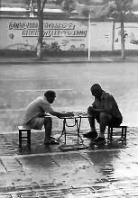 8月1日12时20分,暴雨如注。而此时,正在郑州市秦岭路与淮河路交叉口东约100米路北下象棋的赵师傅和岳师傅,仍在紧张地对弈。两位老人之前约定要三局两胜,此时下到第三局还未决出输赢,因此谁都不肯罢手。“刚开始,雨下得并不大,我看老赵坐在那里不肯起身,我也不想停手,所以就淋着雨继续下棋。”8月3日下午,记者见到了环卫工岳师傅,说起当时在大雨中与老棋友一起下棋的情形,他忍不住笑了。记者问这一局谁赢了,岳师傅竟然记不清了,他说,当时雨太大,两人下得稀里糊涂,也没分出输赢。