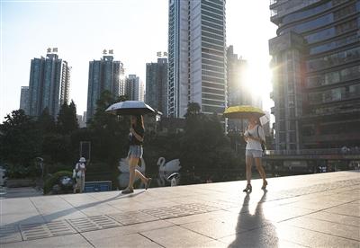 市民走过重庆市江北区观音桥步行街(7月19日摄)。当日,重庆市气象台发布高温红色预警信号,多个区县的气温达40℃以上。 新华社记者 王全超 摄