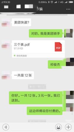 26日下午2点左右,他接了一单帮送文件的订单,对方联系时用了虚拟电话号码,“当时对方要求加我微信,不肯见面,我就觉得有点怪怪的。”他没来得及细想,加了微信后,对方发来三份文件,叫他帮忙打印后送去闵行区银杏北区。