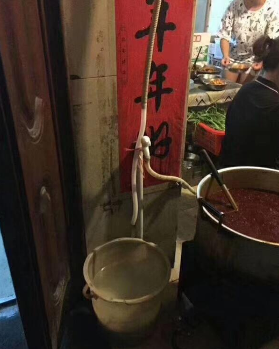 流传在微信朋友圈中的一组照片显示,一螺蛳粉店的汤锅旁,摆着一个盛着水的塑料桶,里面泡着少量白色物体,疑似米粉。塑料桶上方,一根长胶管顺着墙壁垂落下来,正往桶里滴着水。