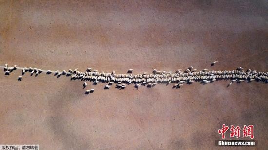 当地时间6月2日,在澳大利亚新南威尔士Tamworth郊区的一片土地上,羊群在干旱的土地上吃着谷物。