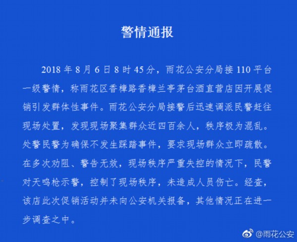 今日有网友发视频称,湖南长沙雨花区一茅台直营店开展促销活动,吸引众多顾客到现场抢购,因现场失控,甚至引民警鸣枪示警。长沙公安局雨花分局下午发通报称,6日8时45分,雨花公安分局接110平台一级警情,称雨花区香樟路香樟兰亭茅台酒直营店因开展促销引发群体性事件。分局接警后迅速调派民警赶往现场处置,发现现场聚集群众近四百人,秩序极为混乱。为确保不发生踩踏事件,民警要求现场群众立即疏散。在多次劝阻、警告无效,现场秩序严重失控的情况下,民警对天鸣枪示警,控制了现场秩序,未造成人员伤亡。经查,该店此次促销活动并未向公安机关报备,其他情况正在进一步调查之中。(北青报记者 孔令晗)