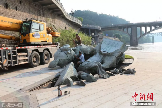 8月5日,雕塑“又”被冲倒,苏东坡雕塑碎裂在地“身首分离”。来源:视觉中国