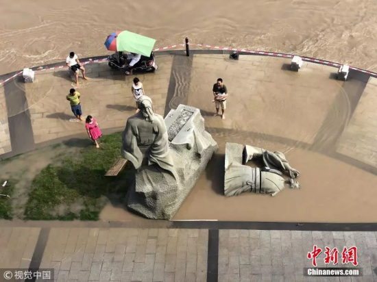 7月18日,“苏东坡”雕像被冲倒,倒在了地上。来源:视觉中国