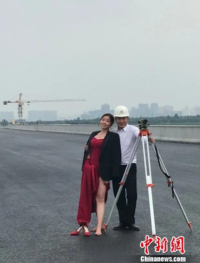 安全帽、全站仪、塔尺等工程测量工具为拍摄道具,还未竣工的大桥地面刚铺的沥青还粘鞋底,就是在这样的施工工地上,张小磊和曹艺穿着漂亮的礼服,完成了婚纱照的拍摄。