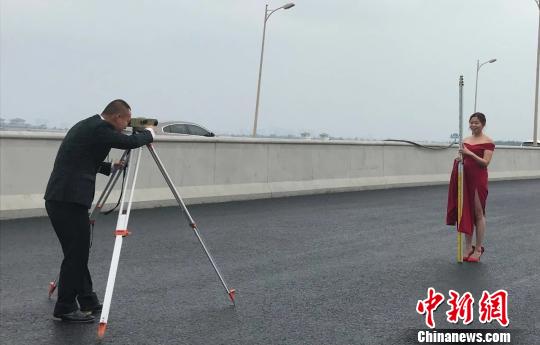图为张小磊和曹艺在未竣工的大桥上拍摄婚纱照,地面上刚铺的沥青还粘脚。 丁佳原 摄