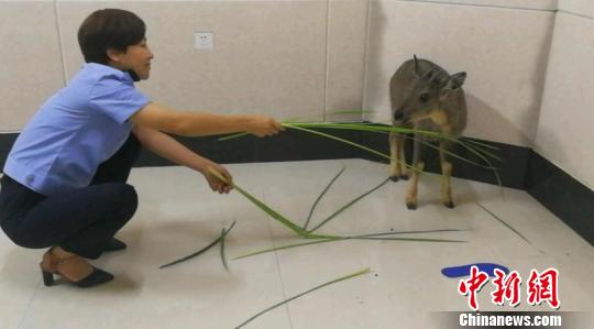 图为民警给疑似国家二级保护动物斑羚喂食。文山州森林公安局供图