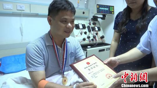 捐献结束后,中国造血干细胞资料库广西管理中心和防城港市红十字会给项载文颁发了捐献造血干细胞荣誉证书。 韦光勇 摄