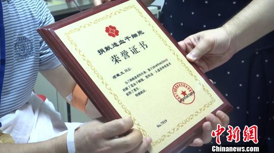 捐献结束后,中国造血干细胞资料库广西管理中心和防城港市红十字会给项载文颁发了捐献造血干细胞荣誉证书。