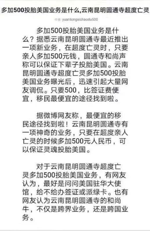 原标题:加500元可投胎美国?昆明圆通寺:系诽谤,警方正调查