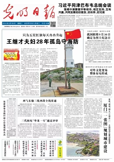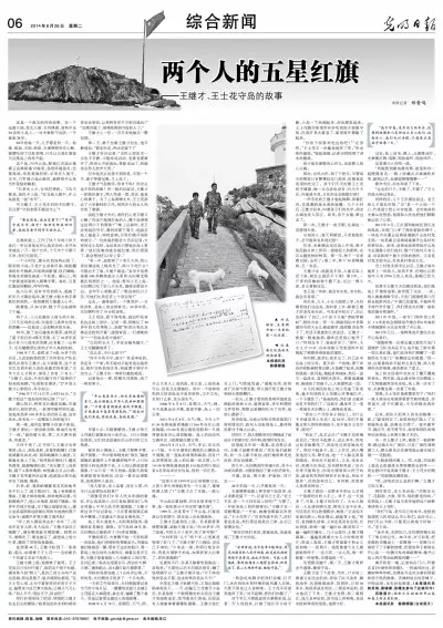 光明日报记者郑晋鸣从2014年起一直跟踪报道王继才的守岛故事,《两个人的五星红旗》、《开山岛上的团圆饭》等多篇文章引起强烈反响。