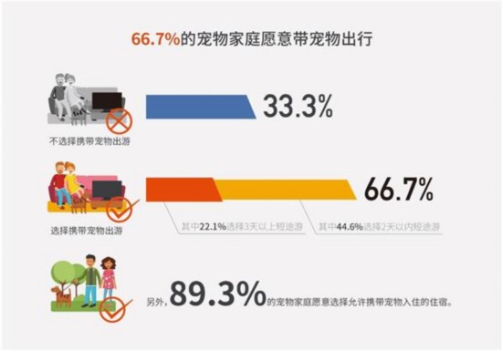 近年来,豢养宠物的家庭越来越多。途家调查数据显示,家中拥有宠物,且愿意携带宠物一同出行的家庭占比达到66.7%,33.3%的家庭出行不愿意携带宠物,主要是由于出行交通困难、宠物用品携带麻烦、以及旅游住宿地通常无法让宠物进入。如果有民宿允许游客携宠物入住,愿意携带宠物出行的家庭比例则上升到89.3%。