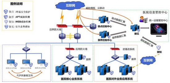 其中,在终端安全防护方面,腾讯御点终端安全管理系统可提供木马病毒防护、漏洞修复、P2P共享库文件保护、应用防火墙策略、防篡改系统等,保障医院核心业务和内外业务应用安全。再配合腾讯御界APT威胁监测系统在边界设置邮件网关、腾讯御知WEB威胁检测系统对医院网络设备及应用服务进行定期安全扫描,提高安全防护能力。最终通过腾讯御见安全态势感知平台为医院搭建统一运维管控中心,完成全生命周期的威胁应对机制和自适应安全体系。腾讯智慧安全已实现立体化防护体系,堪称打造了健康大数据的铜墙铁壁。