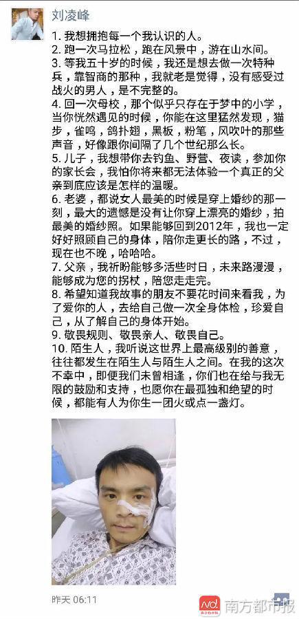 7月29日,刘凌峰的一篇长文几乎感动了整个朋友圈。在文章当中,他希望大家敬畏自然规律、敬畏亲人、敬畏身体。31日,他又在朋友圈写下自己的遗愿清单:拥抱每一个认识的人;跑一次马拉松;带儿子去钓鱼、野营、夜读;照顾好自己的身体,陪妻子走更长的路等。微信好友不仅相互转发,而且彼此提醒,别把跑步、钓鱼甚至陪亲人等,都熬成一种奢望。