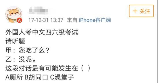 许多网友化身段子手,开始为外国人出起“中文四六级试题” ↓ ↓ ↓
