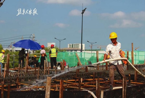 下午4点,虽然已经过了正午最热的时候,但登上高架桥“桥面”,隔着鞋底都能感受到滚烫的热度。一位工人正在为首联现浇梁浇水,进行混凝土养护工作。