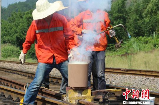 中新网福州8月10日电(邬倔林)8月10日上午6时30分,福建漳平机修车间焊修分队和漳平线路车间后科坪工区职工30多人,进入鹰厦线上的易坑站4号岔区,更换重伤岔芯并进行钢轨焊连。