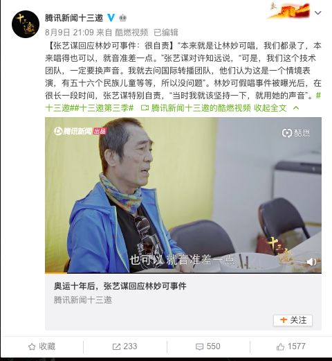 中国青年报注意到,节目中,张艺谋坦言“过意不去“”特别自责”,他说,“当时我就坚持一下,就用她(林妙可)的声音,又有合唱衬着,能不准到哪儿去?就没事了。”