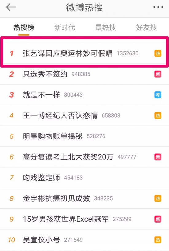 节目播出后,经媒体报道,“张艺谋回应奥运林妙可假唱”登上微博热搜榜首。