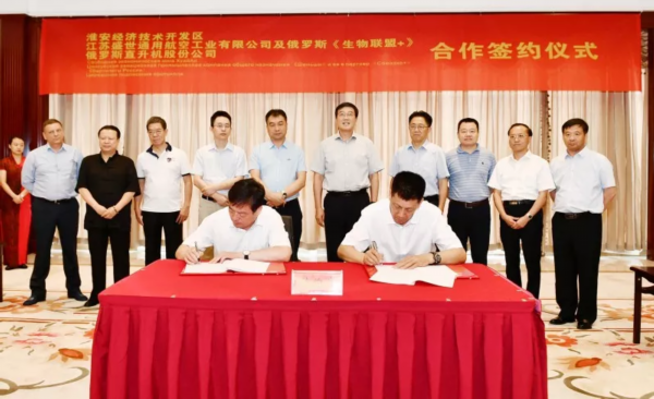 签约仪式上,江苏盛世通用航空工业有限公司分别与俄罗斯《生物联盟+》、俄罗斯直升机股份公司签订技术引进协议。
