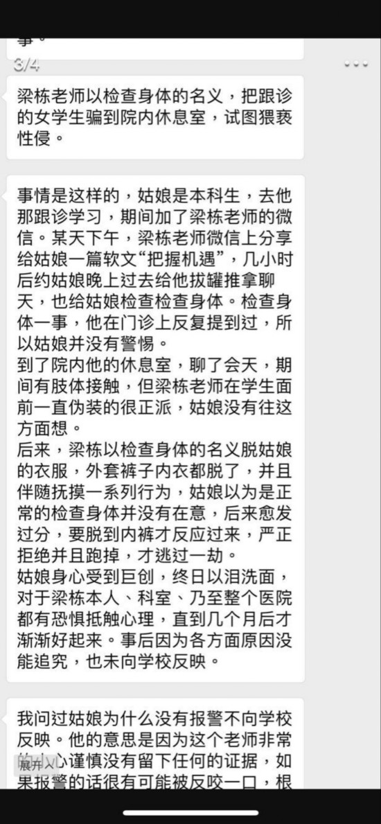 [摘要]举报人称,她在山东中医药大学上研究生期间,遭到导师梁栋两次性骚扰和一次性侵。梁栋当时是山东中医药大学临床医学院的硕导、副教授,也是山东省中医院甲状腺乳腺外科的副主任医师。举报人还公开称,她已经向山东省纪检委、山东省中医院寄出实名举报信。
