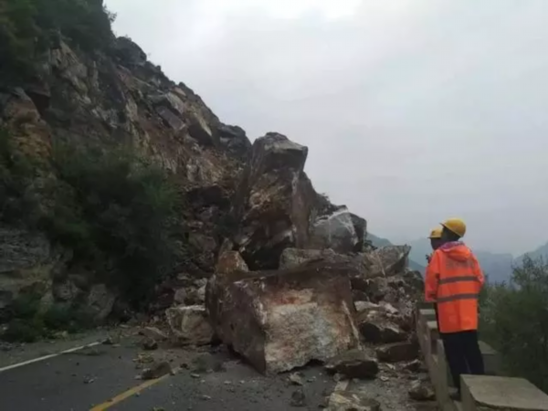 北京房山大安山乡地质灾害群测群防员 安宏三:早上我在村里巡防的时候,听到这边有东西响,开车过来看了,到现场的时候,马路有块大石头,十来吨的大石头,两边有车,我说你们别过了,人也别走。