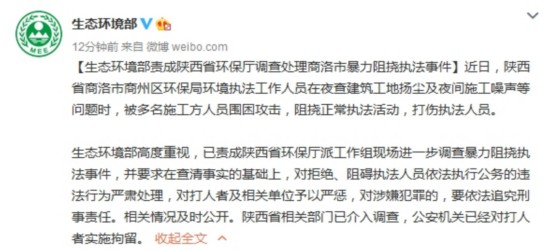 据生态环境部官方微博消息,针对陕西省商洛市暴力阻挠执法一事,生态环境部今日责成陕西省环保厅进一步调查,并对拒绝、阻碍执法人员依法执行公务的违法行为严肃处理。据悉,公安机关已经对打人者实施拘留。