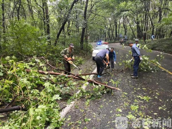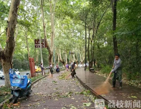 钟山风景区工作人员从凌晨开始作业,清理景区各大主要道路上断枝、落叶。首先迅速清理主干道路面,各标段立即开始巡查各个路段及主要出入口,摸清工作量,合理调派人手清扫重点路段。