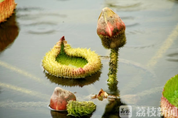 13日上午,市民柳先生游玩南京中山植物园,在园中突然发现池塘里的王莲开花了,花色白中带着淡淡的粉色。与荷花不同的是,王莲的花开在几片大如澡盆的叶子中央,花瓣重重叠叠。从一朵尚未开放的花苞上可以看到,花苞外有刺。站在池塘边,可以闻到淡淡的花香。