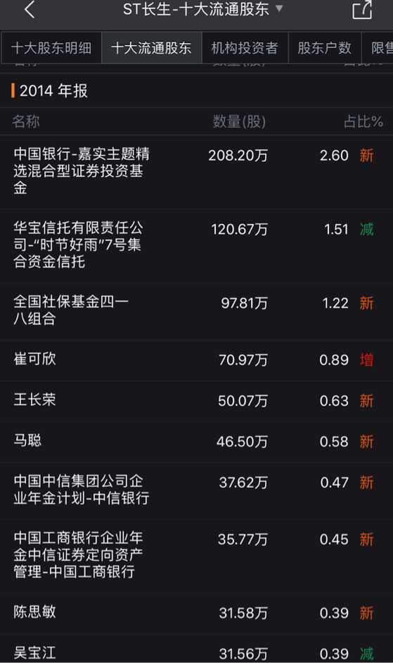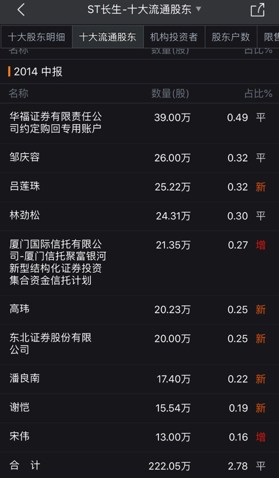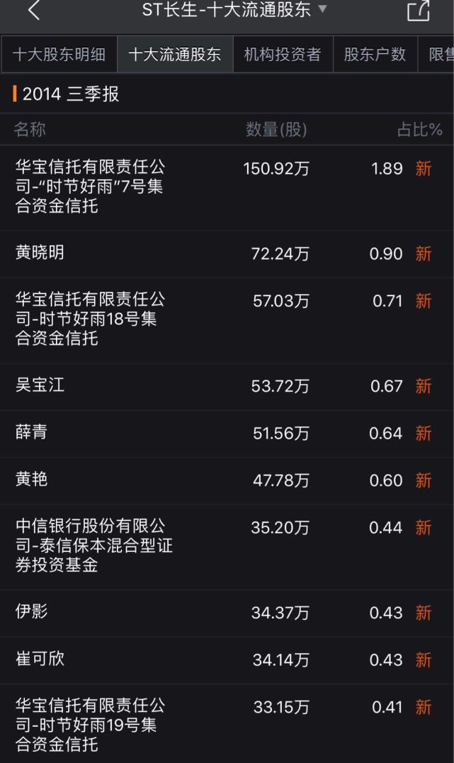 回到2014年三季度,上述16个账户中的至少6个账户,又在长生生物的前十大流通股东名单中“偶遇”,准确的说是长生生物的前身—黄海机械“偶遇”,彼时长生生物尚未借壳黄海机械。