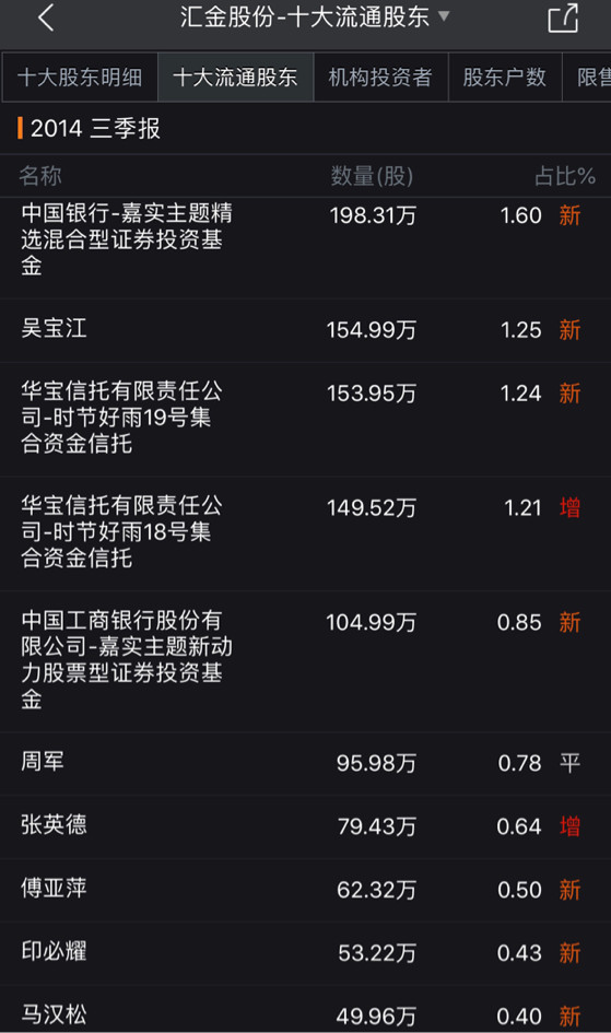 2014年,汇金股份三季报的十大流通股东显示,吴宝江、华宝信托”时节好雨”19号集合资金信托和华宝信托“时节好雨”18号集合资金信托分列第二、三、四位。