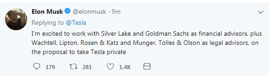 北京时间8月14日上午消息,马斯克发推称正与金融顾问银湖资本和高盛合作,推进特斯拉私有化。