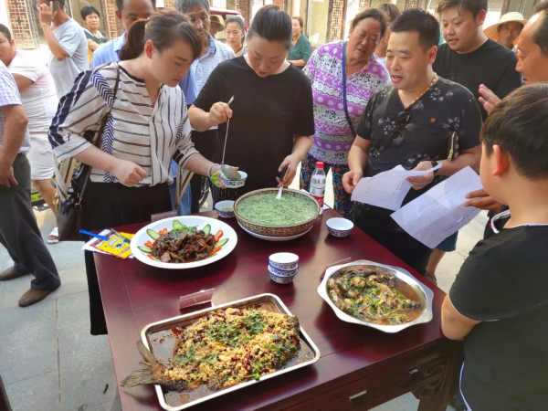 本次活动得到了骆马湖旅游集团的大力支持,特邀请星辰国际3位大厨现场指导,并与黄墩2位当地美食专家组成评委团,根据色、香、形、味、口感、卫生等指标对各菜肴进行百分制评分,经过评委审慎品评,“黑鱼豆妈”“红烧甲鱼”“黑鱼爱萝卜”等三道菜分获第一、二、三名。
