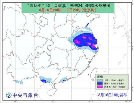 今明天登陆前后,苏浙沪等地将掀狂风暴雨。预计,16日20时至17日20时,东海北部和黄海西南部的部分海域、江苏东南部沿海、长江口区、上海沿海、杭州湾、浙江东北部沿海将有8-9级大风,“温比亚”中心经过的附近海域或地区风力可达10级,阵风11-12级。江苏大部、浙江中北部、上海、安徽大部、河南东南部、湖北北部等地有大到暴雨,其中浙江北部、江苏南部、上海南部、安徽东部和大别山区局部地区有大暴雨(100~180毫米)。松散的结构会使它带来的降雨也相对分散,可能出现外围降水强于中心附近的情况,由于结构不对称,台风北侧风雨较大。