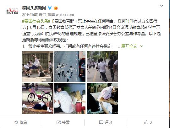 原标题:泰国教育部:拟禁止学生在任何场合、任何时间有过分亲密行为
