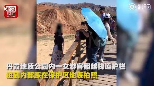 13日,甘肃张掖丹霞地质公园内一游客不顾工作人员及其他游客提示,执意翻越栈道护栏,进到内部踩在保护区地表拍照。工作人员介绍丹霞地貌属不可再生资源,一个游客的脚印地表需要60年才可能恢复原貌。