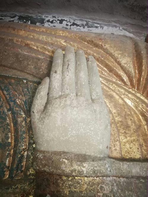 1992年遭重绘的睏佛寺主尊造像局部,表面金箔和彩绘已逐渐脱落,原貌逐步恢复