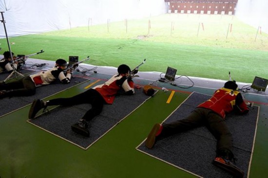 7月27日,北京,中国国家射击队举行亚运会前的集训模拟考核。图为选手们在卧姿比赛中。视觉中国 图