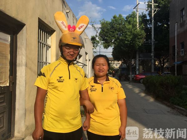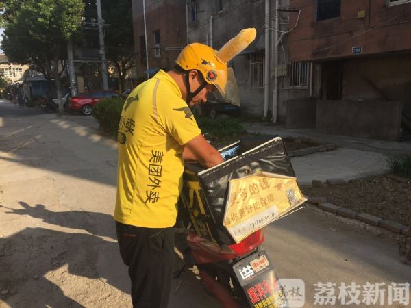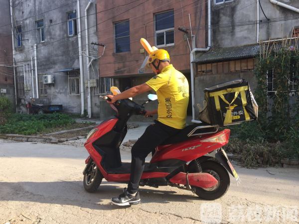 在五矿澜悦栖原,蒋翔东准时为客户送上午餐,正值日中,衣服早已被汗水打湿,但他没有停歇,立刻赶往下一个接单点。28岁的蒋翔东是一名美团外卖配送员,小四岁的妻子彭程也是一名外卖小妹。两人早上7点上班,晚上九点下班,每天要配送30单左右,来回奔波在秣陵路5公里范围以内,尽力为每一位客户准时送上新出炉的外卖。