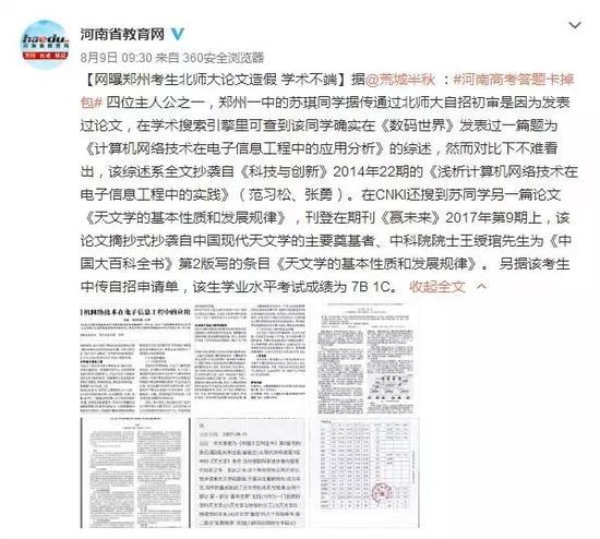 “高考答题卡疑被调包”的调查结果已经公布,不存在人为调包试卷和答题卡现象。但又挖出了更多“黑料”:涉事4名考生之一的苏同学,通过高校自主招生初审的论文被发现涉嫌抄袭,其所在郑州一中还有另外四位同学的论文也存在同样的问题。苏同学父亲,某国家司法机关公职人员甚至表示:“天下论文一大抄。”