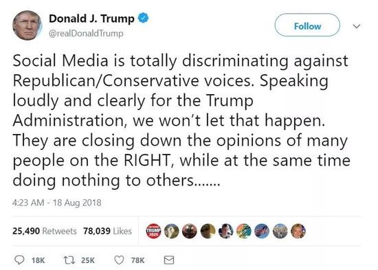 “他们封杀了许多右派的观点,却对其他人的观点无动于衷”——昨晚,美国总统特朗普在他的个人社交账号上这样控诉道,“社交网站对保守派和共和党存在明显的歧视”。