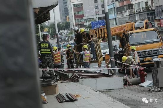 △ 深圳坂田某街道,刘蒙的日结工作是帮助城管拆除街边的广告牌。他们这些找来的“临时工”因为没有技术,大多是打打杂,维持一下现场的秩序,8个小时120元钱。