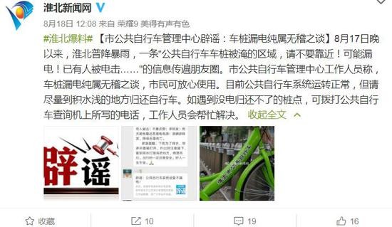 原标题:淮北市公共自行车管理中心辟谣:车桩漏电纯属无稽之谈