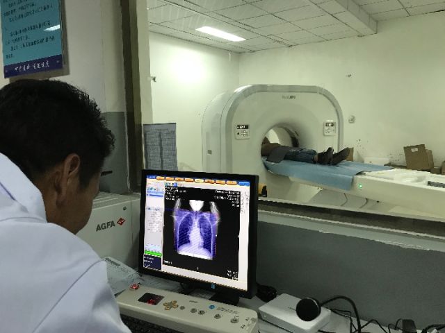 青海省玉树藏族自治州人民医院影像科内,藏族医生给藏民做CT检查。新华社记者邰思聪摄