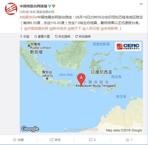 @中国地震台网速报 正式测定:08月19日22时56分在印尼龙目岛(南纬8.50度,东经116.65度)发生6.9级地震,震源深度20千米。