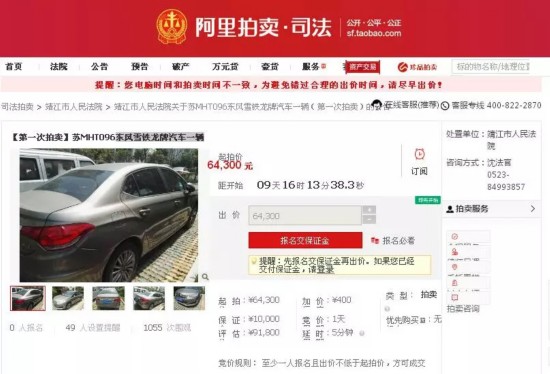 评估价9.18万元,起拍价6.43万元,保证金1万元,增价幅度400元