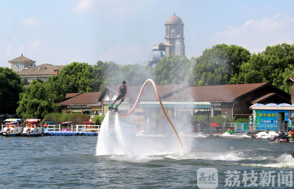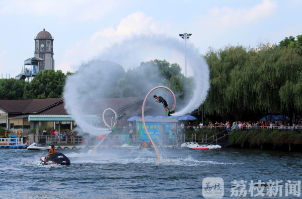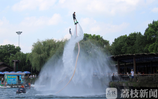 8月19日,在常州市一处旅游景区的宽阔水面,数名特技演员呈现的“水上飞人”表演,令众多消暑休闲的游客大饱眼福。
